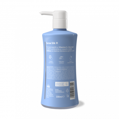 Sapun lichid SenseSilk+ , catifelare si eleganta pentru pielea ta! Imbogatit cu brontide catifelante si vitamina E, acest sapun lichid hidrateaza delicat si protejeaza pielea, oferindu-i o senzatie finete si confort. Cu 97% ingrediente de origine naturala, formula sa blanda curata eficient, mentinand echilibrul natural al pielii. Rasfata-ti simturile cu un parfum rafinat, ce imbina notele delicate si sofisticate de magnolie alba si casmir, transformand fiecare spalare intr-o experienta de pura eleganta si relaxare!